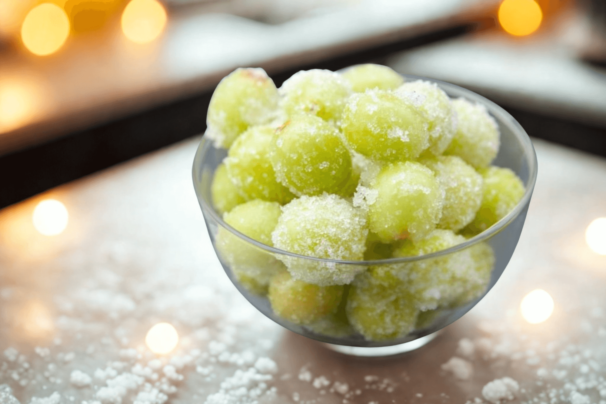 2. Lägg druvorna i en skål och häll över kyld prosecco. Dem ska täckas helt.