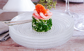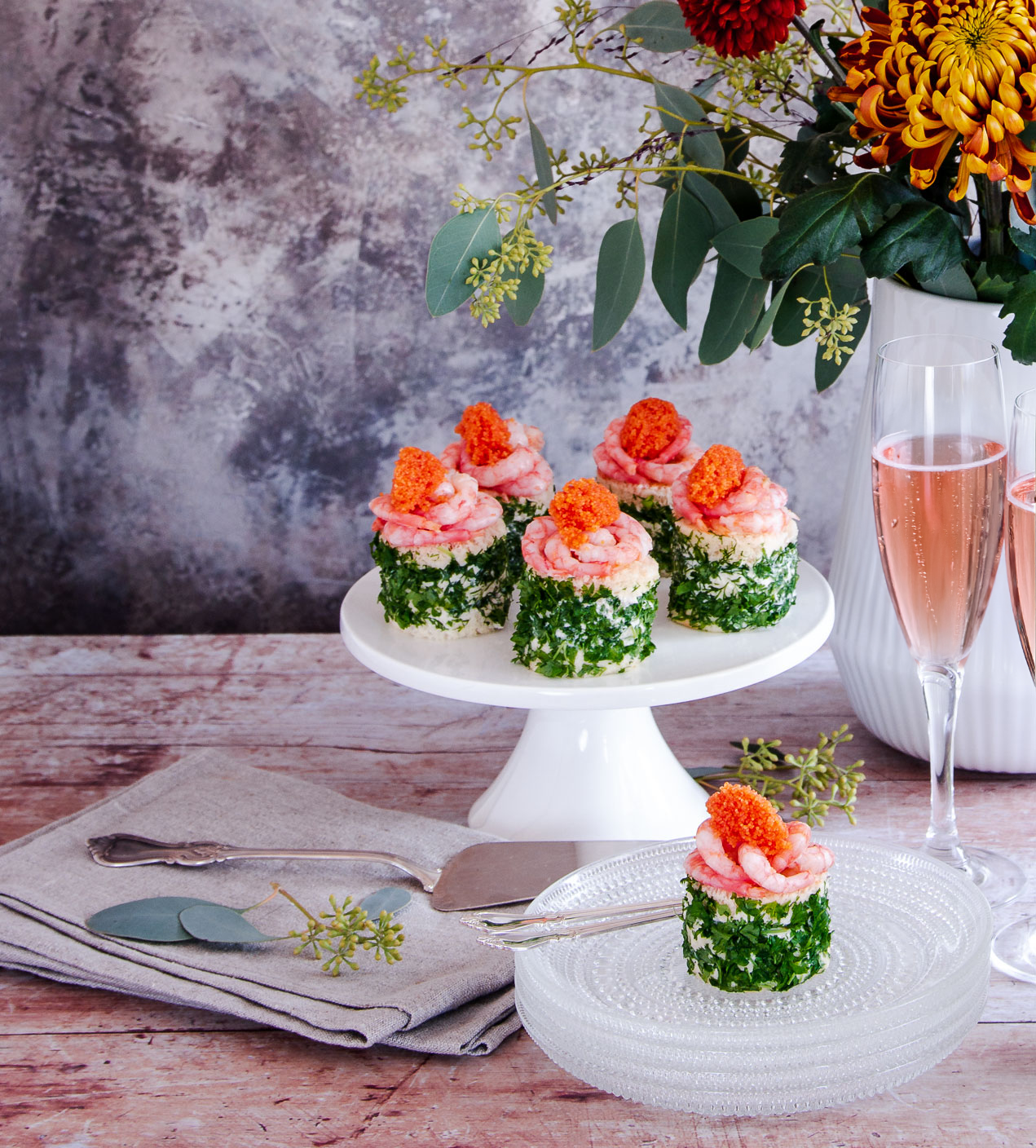 Finns det något festligare att bli serverad än en smörgåsbakelse tillsammans med ett iskallt och krispigt glas mousserande vin? Dessa vackra små skapelser med smak av räkor, örter och rom kan du enkelt göra hemma och imponera på dina gäster. I glaset väljer vi mousserande rosévin med härlig frukt som gifter sig med bakelsens smaker. Bubbel + skaldjur = sant!